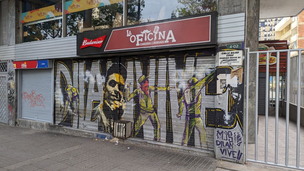 There are many murals commemorating Dilan at the intersection. This one reads “Dilan Vive” (Dilan Lives). Note the white sign on the right side of the screen listing the street’s unofficial name: “Dilan Cruz Street”.